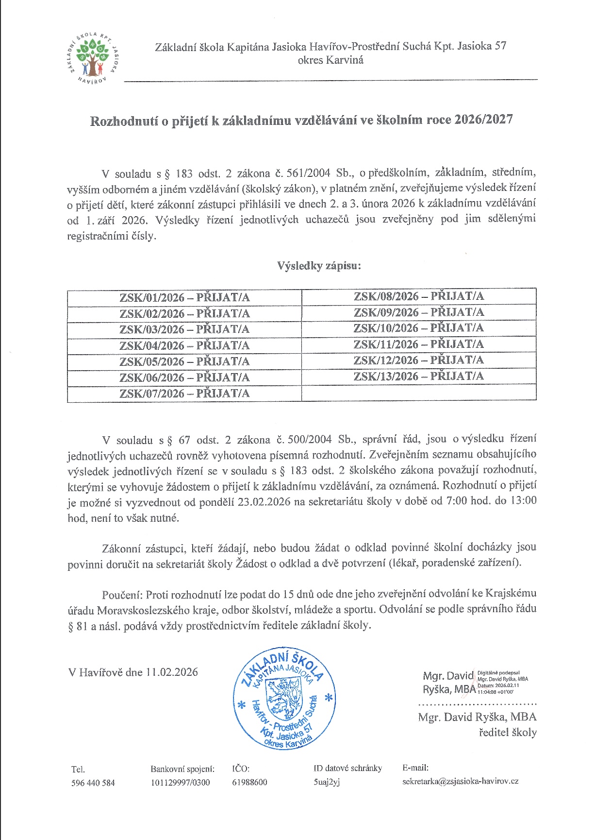 Ředitel Základní školy Kapitána JasiokaHavířov-Prostřední Suchá Kpt. Jasioka 57 okres Karviná zveřejňuje ...