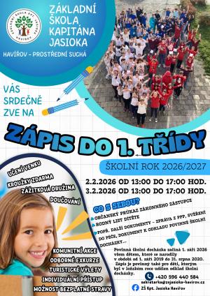 zveme Vás k zápisu do 1. třídy pro školní rok 2026/2027, který se uskuteční v pondělí 02. 02. 2025 a v úterý 03. 02. 2026, vždy v době od 13:00 do 17:00 hodin.