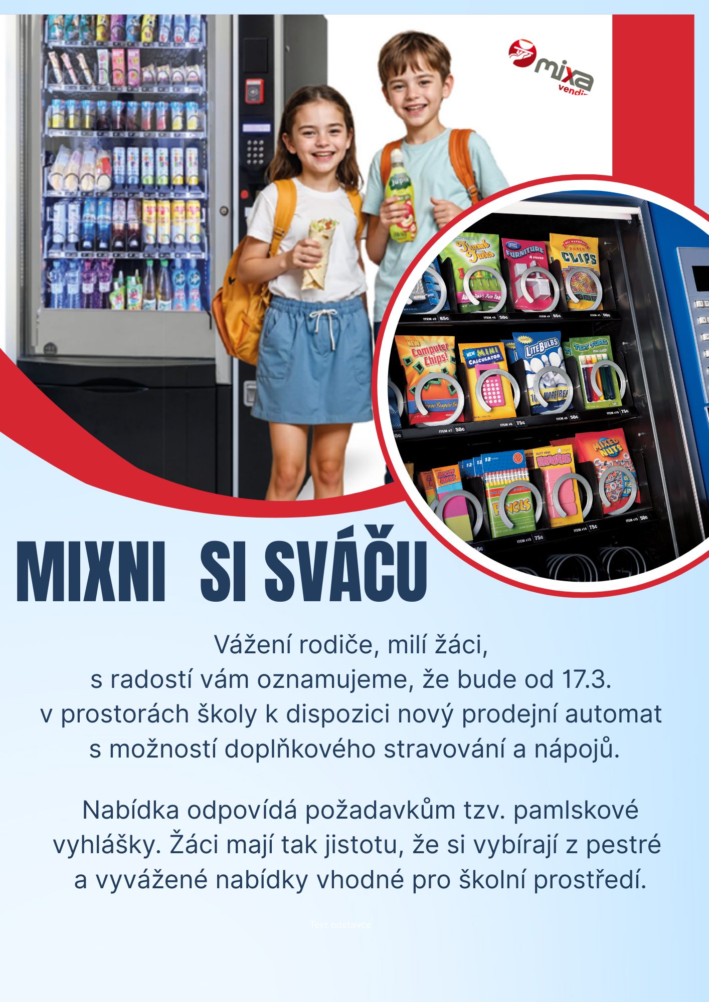S radostí oznamujeme, že v prostorách naší školy je nově k dispozici prodejní automat se svačinami a nápoji. Žáci si tak mohou během dne pohodlně zakoupit drobné občerstvení i pití přímo ve škole.